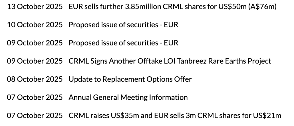 As of 30 Jun 25, it is reported in their 20F that the insiders own no shares directly, and most own CRML through their ownership of EUR. Of course, the management is issued RSU’s as part of their compensation and bonuses.