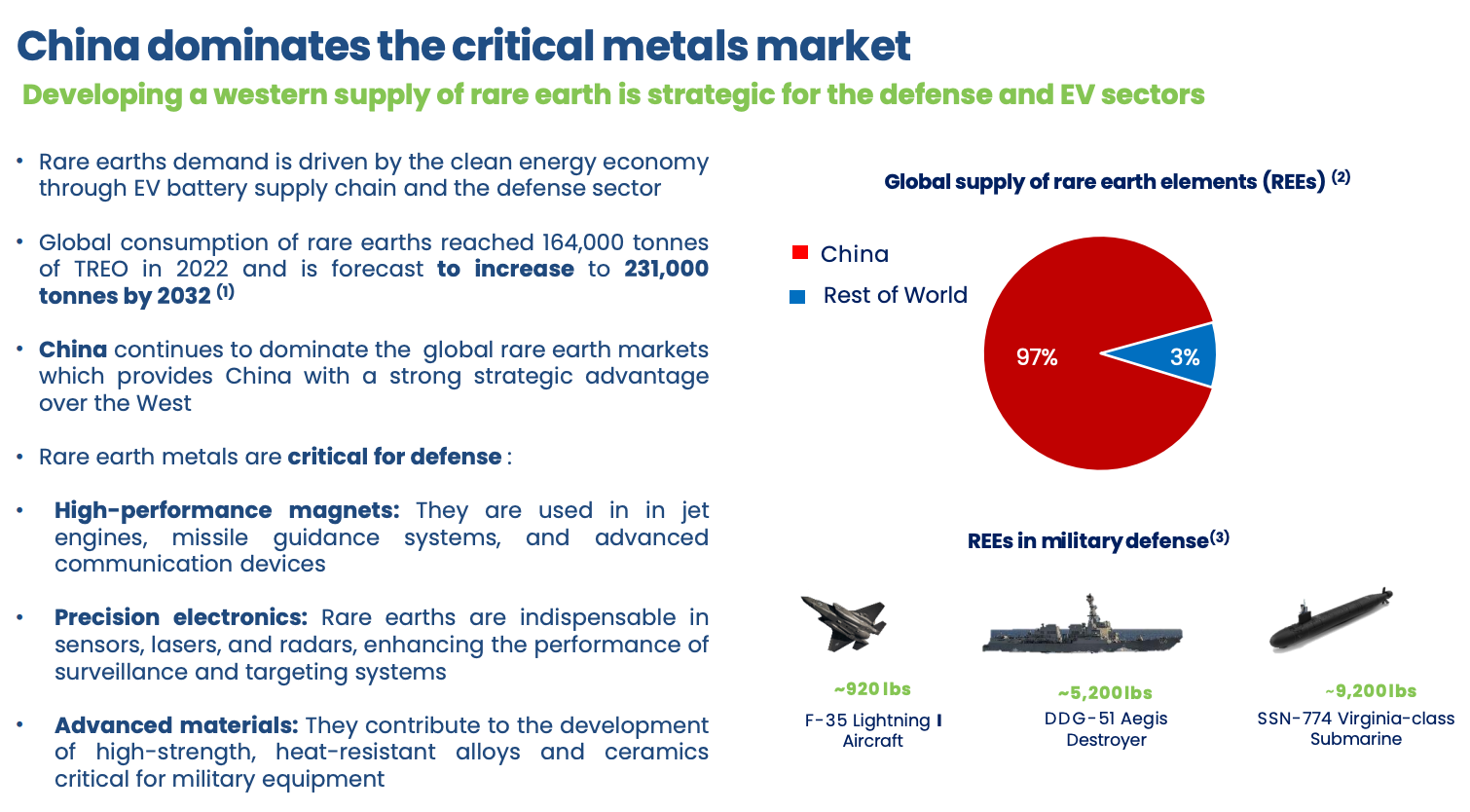 The Rare Earth Element (REE) industry has quickly become a fierce and contentious battleground between the West and China. REE is used in permanent magnets, catalysts, metallurgy, battery alloys, and many more. They are essential in the production of hybrid and electric vehicle engines, generators in wind turbines, hard disks, cell phones, and defence systems.