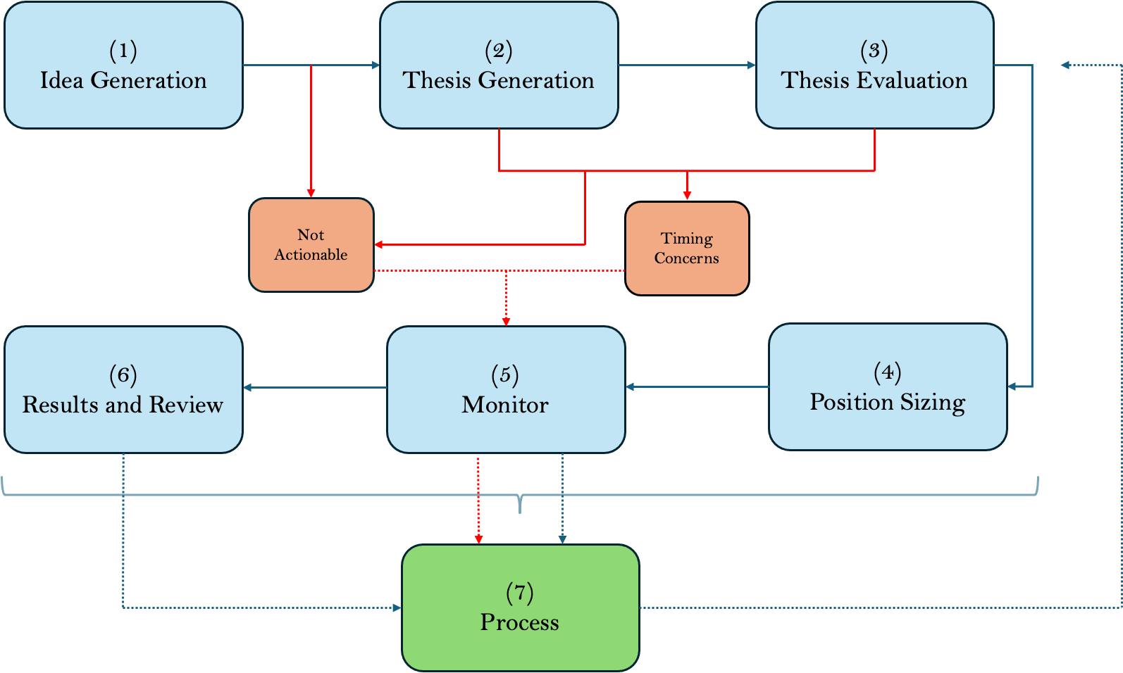 The natural filter of going from (1) to (4) stress tests the potential idea through multiple rounds of evaluation from various angles. The byproduct of the filter, however, is not all junk. Some will be monitored for either educational purposes or potentially being part of the future idea-generation pool. The results of these byproducts are monitored and evaluated for errors of omission.